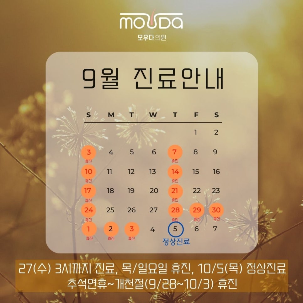 [필독] 모우다의원 9월 진료안내 안녕하세요, 모우다의원을 찾아주셔서 감사합니다. 9월이 시작되어 새로운 한 달이 시작되었습니다. 이번 달에는 다양한 진료 안내와 이벤트