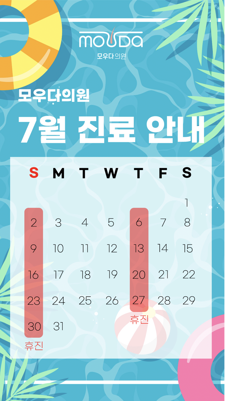 모우다의원 7월 진료안내 안녕하세요! 모우다의원입니다. 7월에도 건강한 생활을 지원하기 위해 다양한 진료를 제공하고자 합니다. 아래는 7월 진료안내사항입니다. 진료 안내 –